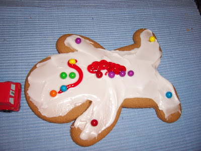 To cap off our good week/good day, we decided to decorate some cookies - J bought a gingerbread man cookie decorating kit at the market on Saturday, and the Evil Genius was just bursting to play with them.